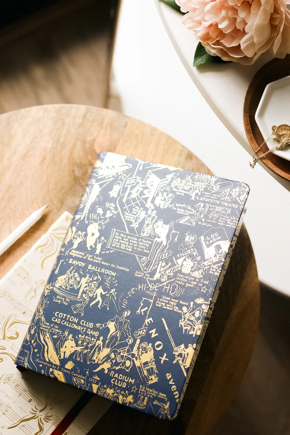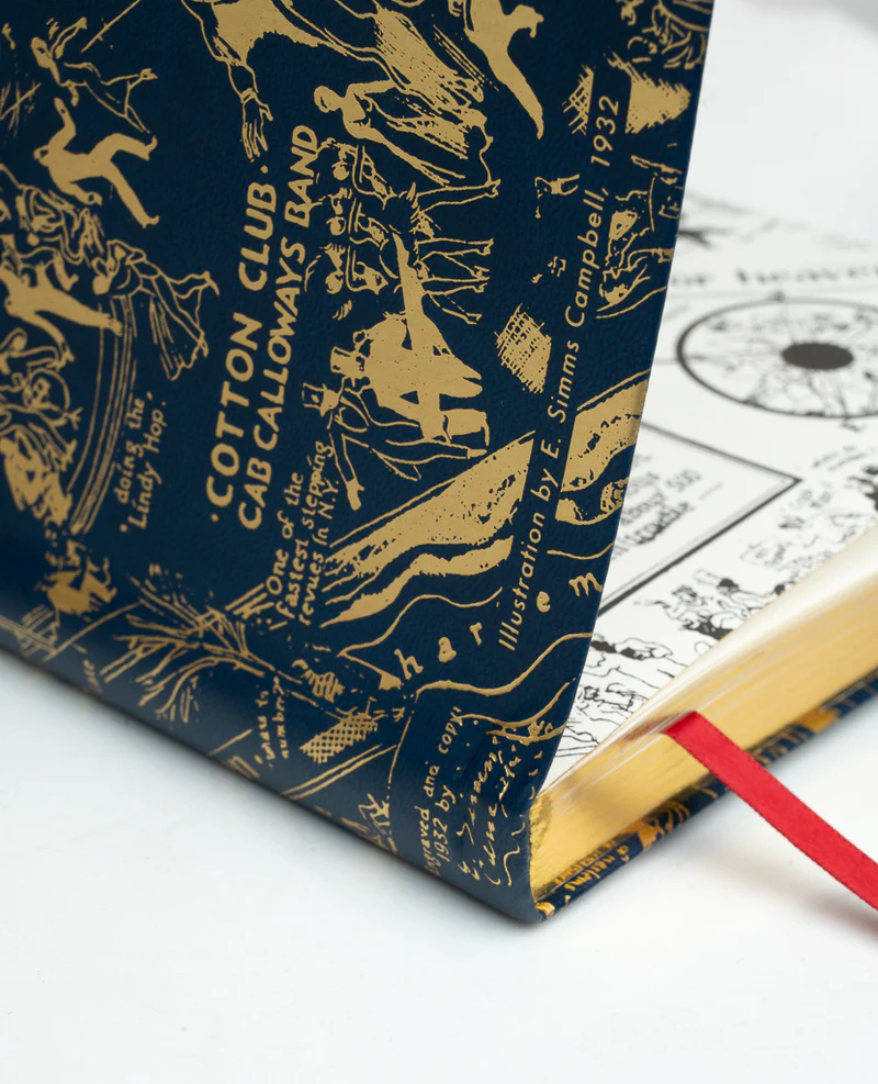 On the cover and inside the journal, Campbell’s witty imagery and personal notes capture the excitement that radiated from Lenox Avenue with Cab Calloway singing at the Cotton Club, Bill “Bojangles” Robinson step-dancing at the Lafayette Theater, and the scene at the Club Hot-Cha, where “nothing happens before 2am”. Also included are spirited “café au lait girls” dancing at Small’s Paradise, Gladys Bentley in her top hat and tuxedo at Gladys’ Clam House, singers crooning at the Radium Club, and recommendations for his personal favorite hangouts, Tillie’s, where “the fried chicken is really good!”, and Log Cabin, “an intimate little spot”.