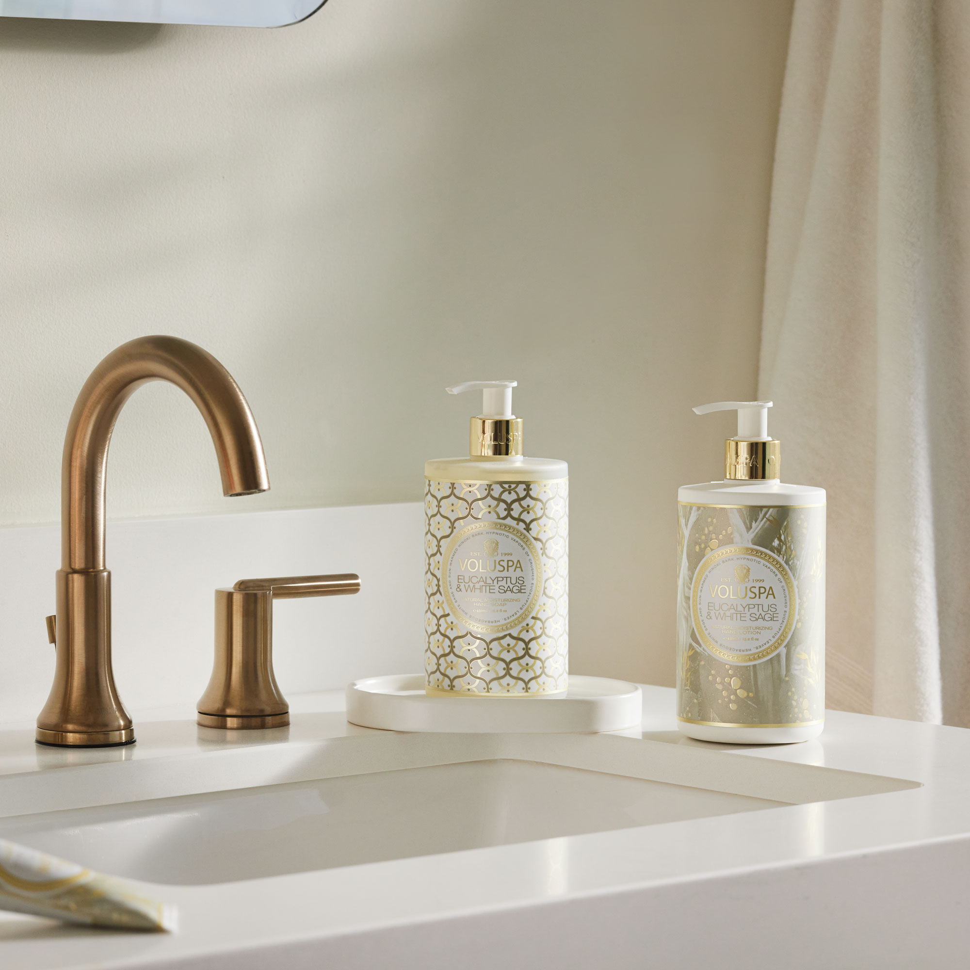 Voluspa’s Moisturizing Hand Lotion is highly covetable with its elegant frosted soft touch finished bottle, wrapped in classic black or white Maison artwork. Pops of distinctive secondary color highlights are coupled with accents of muted gold. An added touch of luxury is also present in the custom logo, embossed on chrome gold collars on all bottle necks. Each bottle is custom designed in-house and created with Post-Consumer Recycled material. The perfect balance of beauty and function, from our house to your home.